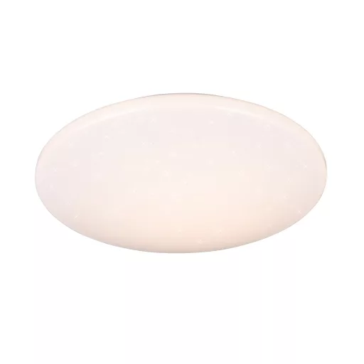 Műanyagból készült mennyezeti lámpa fehér színű, csillagos égbolt effektes burával, beépített meleg fehér színhőmérsékletű LED fényforrással, IP44-es védelemmel. A lámpa mozgásérzékelős, illetve alkonykapcsolós.