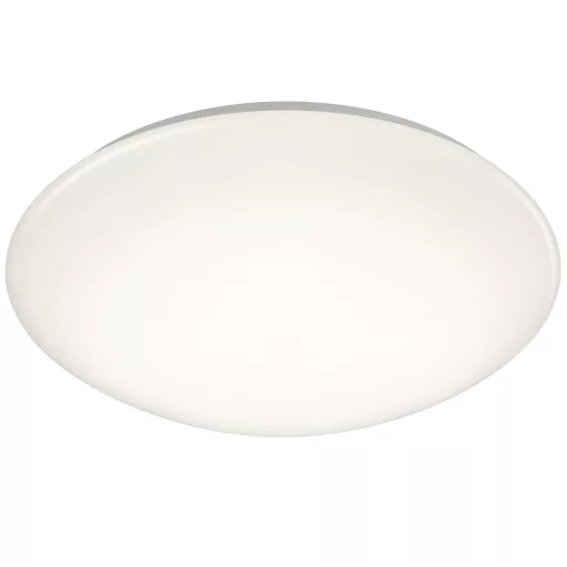 Műanyagból készült mennyezeti lámpa fehér színű búrával, beépített meleg fehér színhőmérsékletű LED fényforrással, IP44-es védelemmel. A lámpa mozgásérzékelős, illetve alkonykapcsolós.