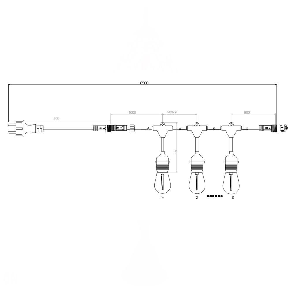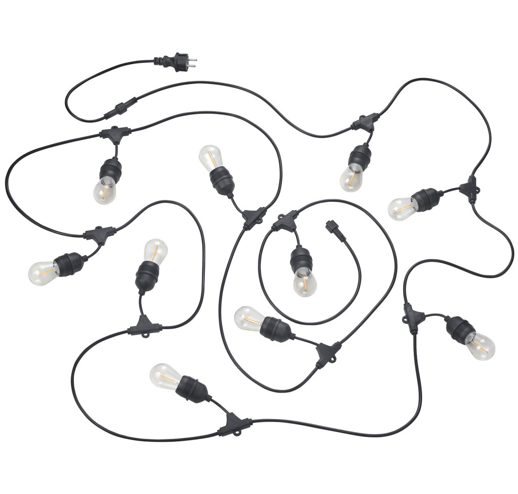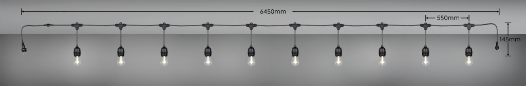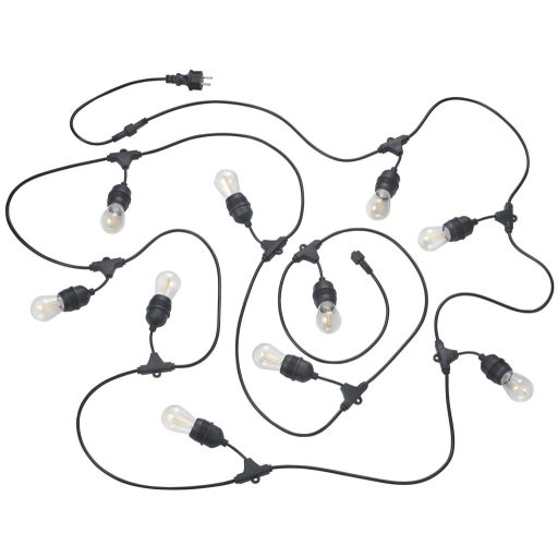 6,5 méter hosszú kültéri fényfüzér 10db meleg fehér színhőmérsékletű, kist teljesítményű E27-es LED fényforrással, IP44-es védelemmel. A füzérek max. 6 darabig sorolhatóak.