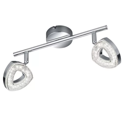 Króm színű fém spot lámpa kritályos acryl betéttel, billenthető fejjel, meleg fehér színhőmérsékletű beépített LED fényforrással.
