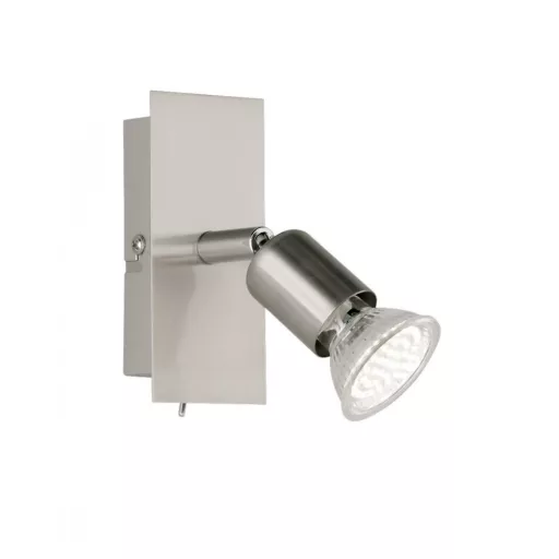 Matt nikkel színű fém búra nélküli spot lámpa billenthető fejjel, GU10-es cserélhető LED fényforrással, lámpatesten lévő kapcsolóval.