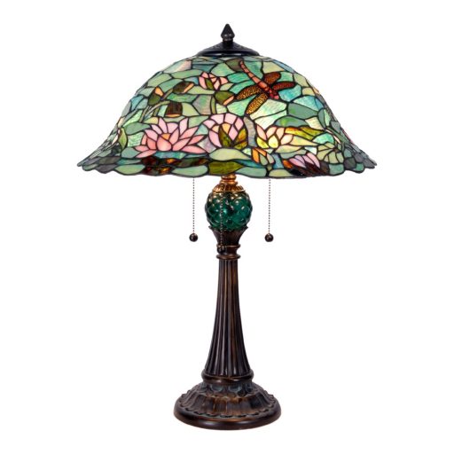 Bronz színű polyresin vázas Tiffany asztali lámpa a szárban dekoratív zöld színű üveg betéttel, nagy méretű színpompás Tiffany üveg búrával, 3db foglalattal, húzókapcsolókkal. A búra dominánsan kék és zöld színekben pompázik, melyet színes virágokkal és szitakötővel díszítettek.