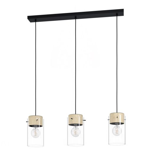Loft stílusú, fekete színű fém vázas függeszték barna-átlátszó színű fa és üveg búrával, E27-es foglalattal.