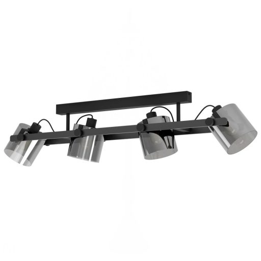 Loft stílusú, fekete színű fém vázas mennyezeti lámpa fekete-átlátszó színű üveg búrával, E27-es foglalattal. A lámpa egyéb tulajdonsága(i): állítható fejű lámpa.