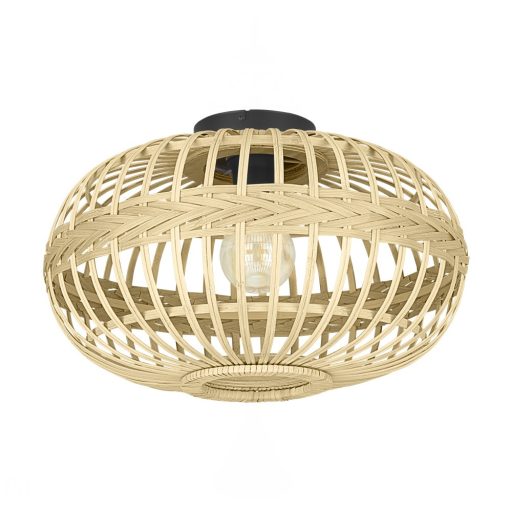 Naturális stílusú, fekete színű fém vázas kerek mennyezeti lámpa barna színű fa búrával, E27-es foglalattal.