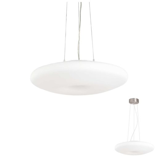 Szatinált nikkel színű fém vázas függeszték lámpa fehér színű fúvott üveg búrával, 3db E27-es foglalattal és rövidíthető belógással.