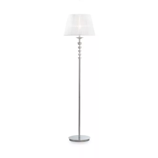 Króm színű fém vázas álló lámpa kristály dekorral, fehér színű organza lámpaernyővel, E27-es foglalattal, vezetékre szerelt kapcsolóval.