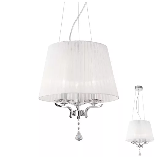 Króm színű fém vázas függeszték kristály dekorral, fehér színű organza lámpaernyővel, rövidíthető belógással.