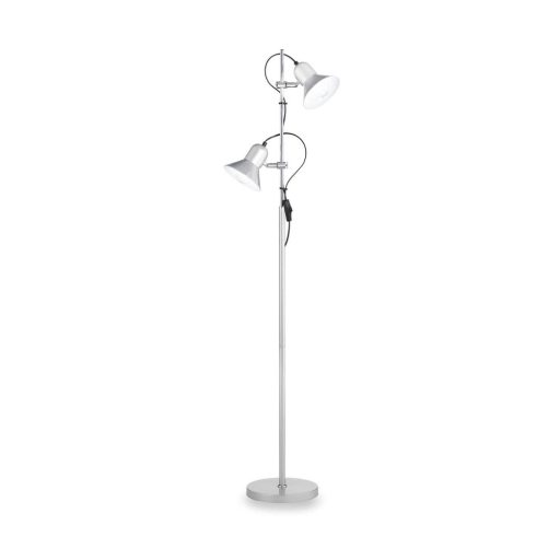 Ezüst és króm színű fém álló lámpa 2db billenthető fejjel, E27-es foglalattal, vezetékre szerelt kapcsolóval.