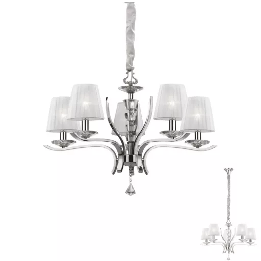 Króm színű fém vázas csillár kristály dekorral, fehér színű organza lámpaernyővel, rövidíthető belógással, bársony lánc takaróval.