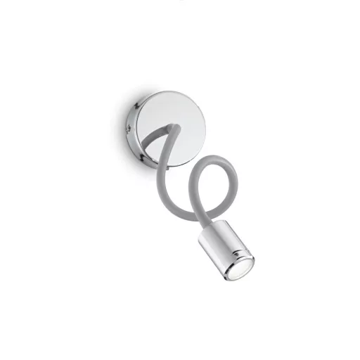 Króm színű fém fali lámpa fekete színű gumival bevont állítható karral, 3W meleg fehér fényű beépített LED fényforrással, lámpatesten elhelyezett kapcsolóval.