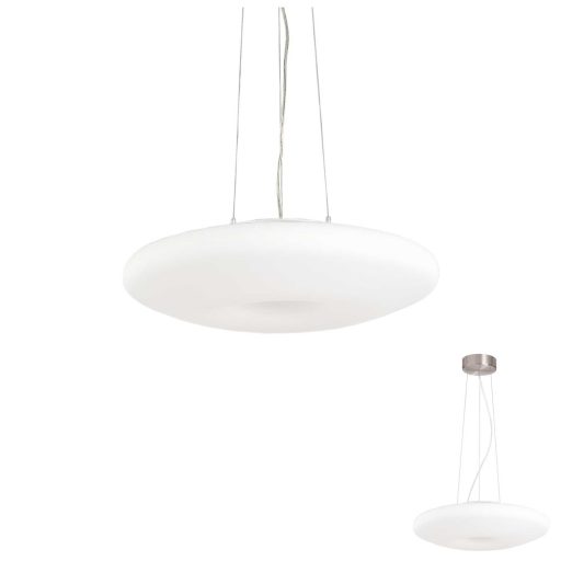 Szatinált nikkel színű fém vázas függeszték lámpa fehér színű fúvott üveg búrával, 3db E27-es foglalattal és rövidíthető belógással.