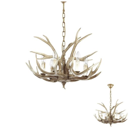 Barna színű fém vázas csillár műgyantából készült szarvas agancs és faragott fa hatású dekorral, 6db E14-es foglalattal, rövidíthető belógással.