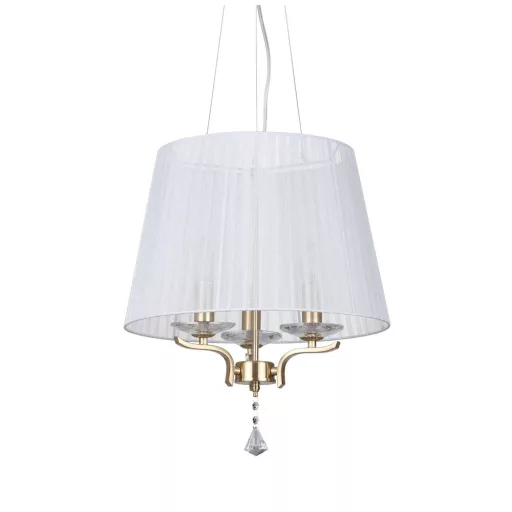 Sárgaréz színű fém vázas függeszték kristály dekorral, fehér színű organza lámpaernyővel, rövidíthető belógással.