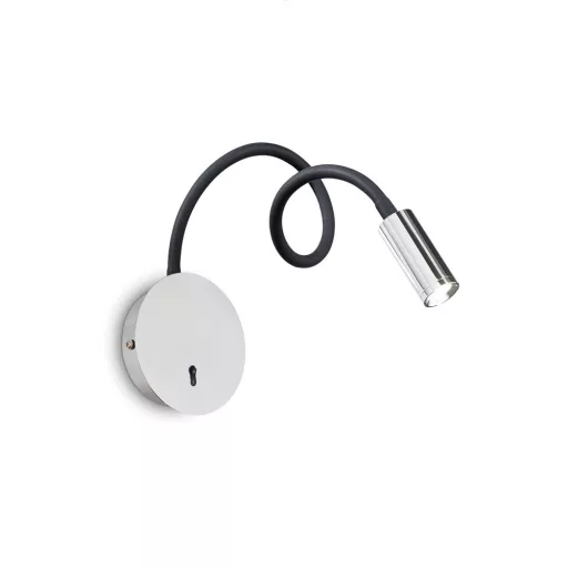 Króm színű fém fali lámpa fekete színű gumival bevont állítható karral, 3W meleg fehér fényű beépített LED fényforrással, lámpatesten elhelyezett kapcsolóval.