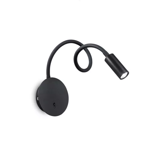 Fekete színű fém fali lámpa gumival bevont állítható karral, 3W meleg fehér fényű beépített LED fényforrással, lámpatesten elhelyezett kapcsolóval.