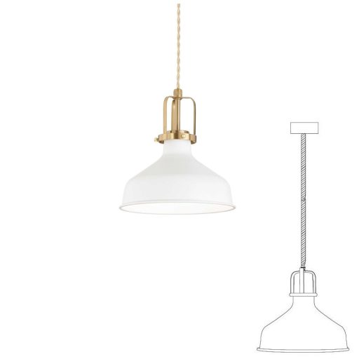 Fehér színű fém függeszték lámpa szatinált arany dekoros búrával, sodrott szövet bevonatos vezetékkel, E27-es foglalattal. A lámpa belógása csökkenthető a kábel rövidítésével.