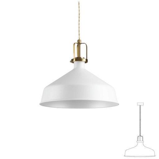 Fehér színű fém függeszték lámpa szatinált arany dekoros búrával, sodrott szövet bevonatos vezetékkel, E27-es foglalattal. A lámpa belógása csökkenthető a kábel rövidítésével.