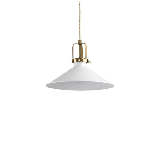 Fehér színű fém függeszték lámpa szatinált arany dekoros búrával, sodrott szövet bevonatos vezetékkel, E27-es foglalattal. A lámpa belógása csökkenthető a kábel rövidítésével.