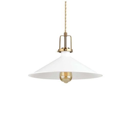 Fehér színű fém függeszték lámpa szatinált arany dekoros búrával, sodrott szövet bevonatos vezetékkel, E27-es foglalattal. A lámpa belógása csökkenthető a kábel rövidítésével.