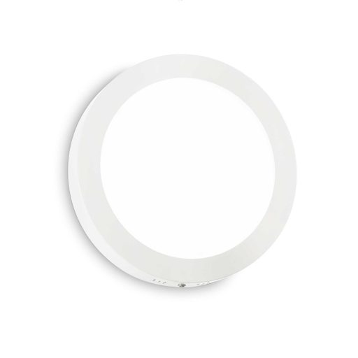 Fehér színű fém keretes falra és mennyezetre egyaránt szerelhető lámpa fehér színű műanyag betétes búrával, beépített meleg fehér fényű LED fényforrással.