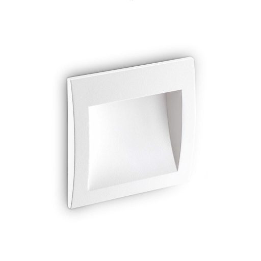 Fehér színre festett alumínium öntvény kültéri falba építhető lámpa átlászó üveg betéttel, beépített 4W meleg fehér fényű LED fényforrással, IP65-ös védelemmel.