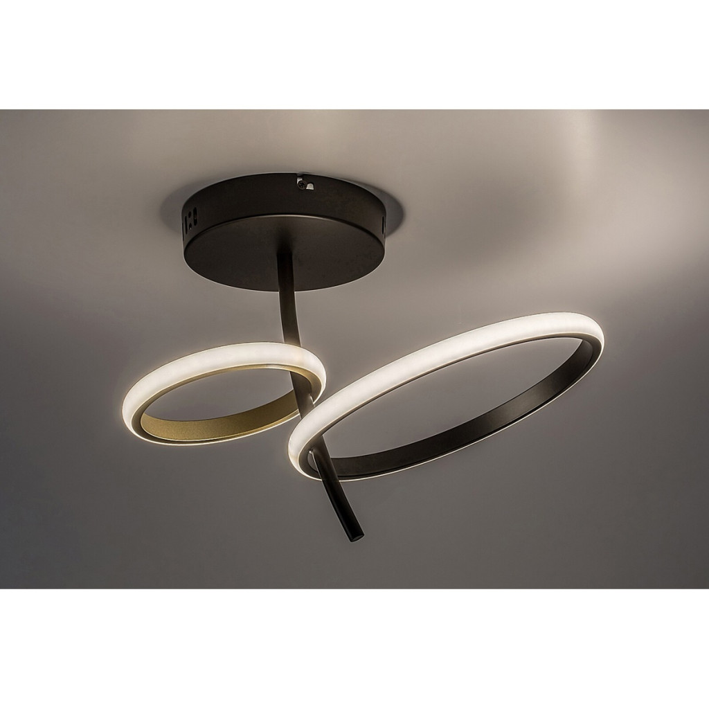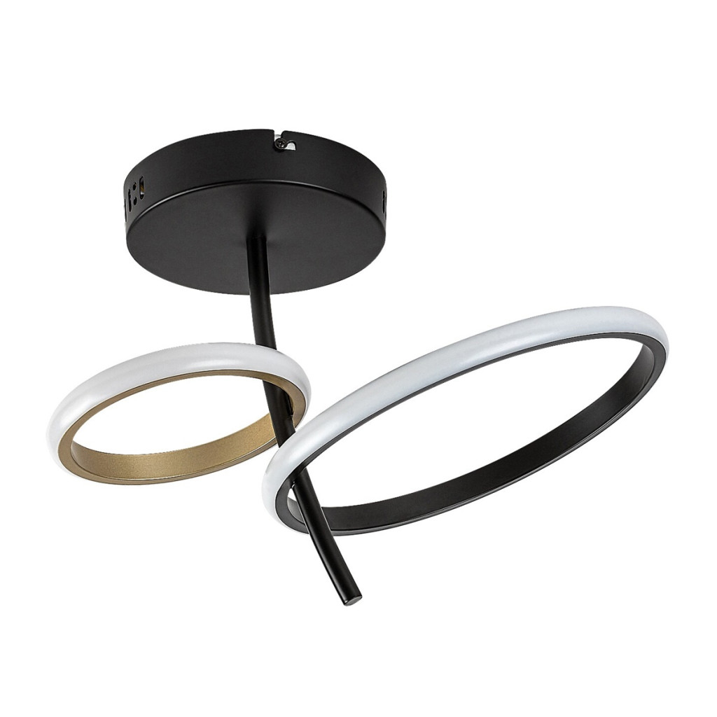 Fekete színű fém vázas mennyezeti lámpa 2 gyűrű alakú, fekete és arany színű fém és fehér szilikon búrával, természetes fehér színhőmérsékletű beépített LED fényforrással.
