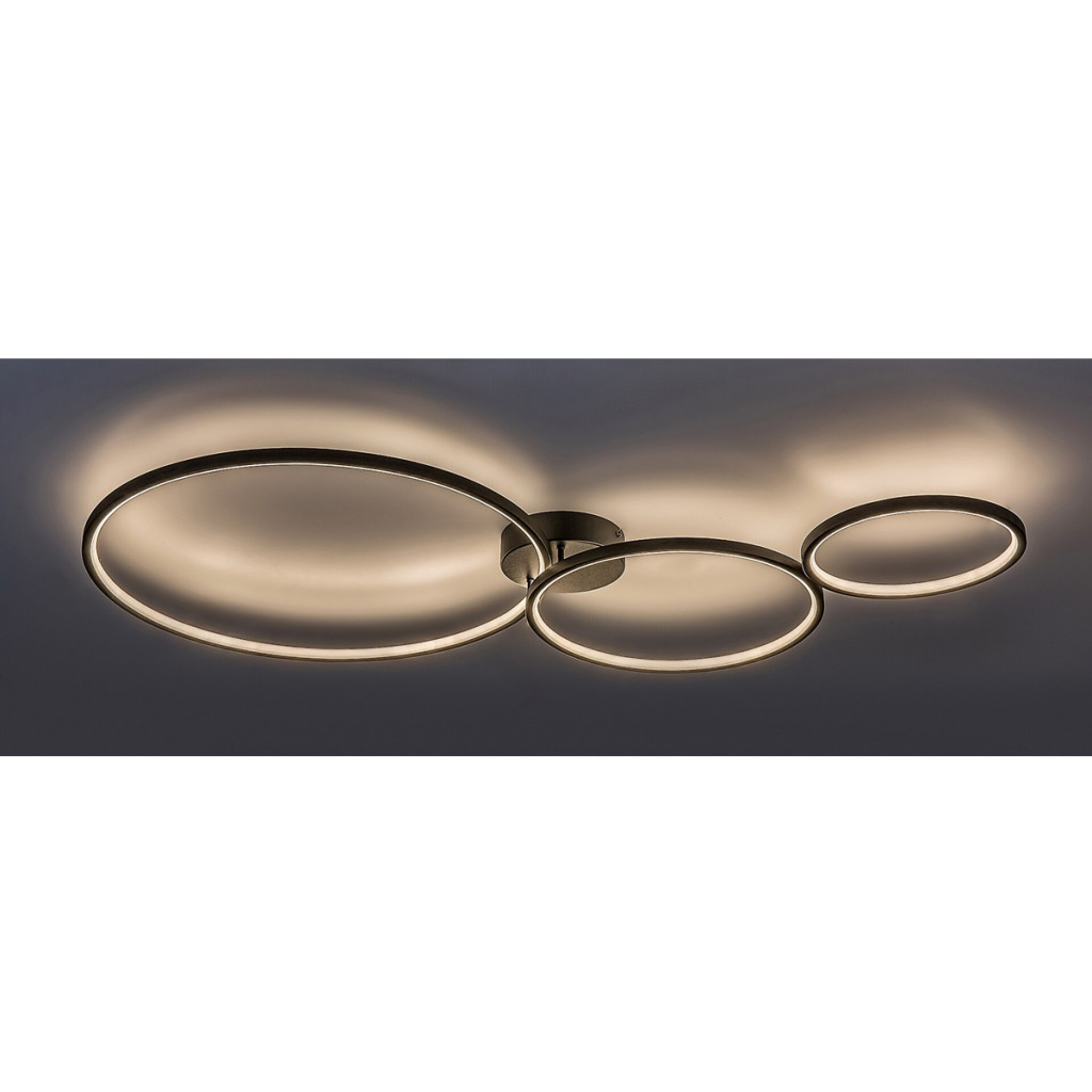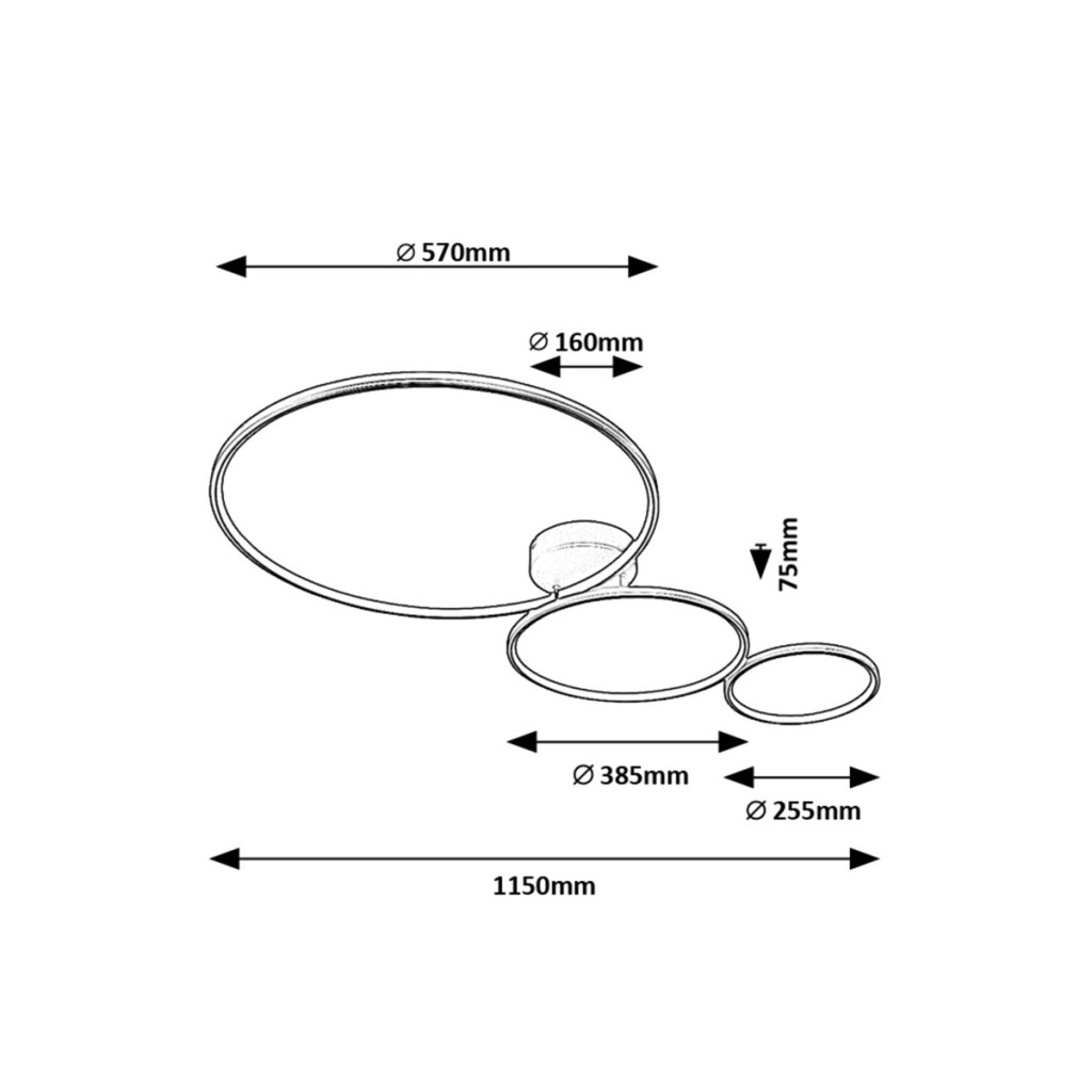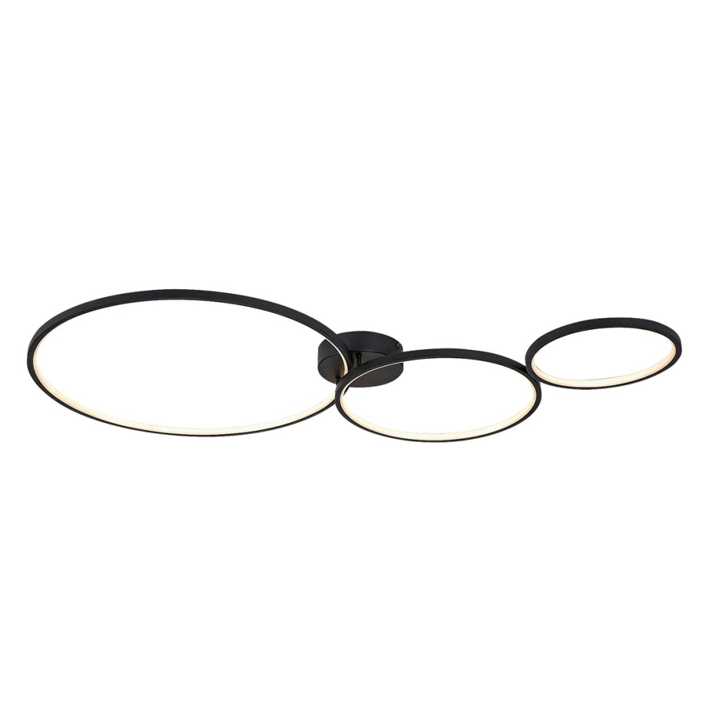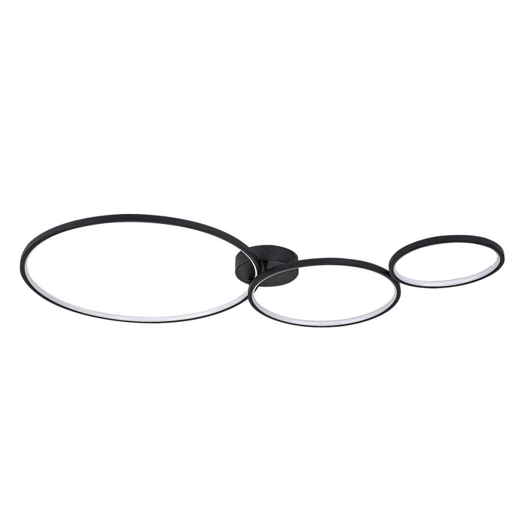 Fekete színű fém vázas mennyezeti lámpa három gyűrű alakú, fehér műanyag betétes búrával, meleg fehér színhőmérsékletű beépített LED fényforrással.