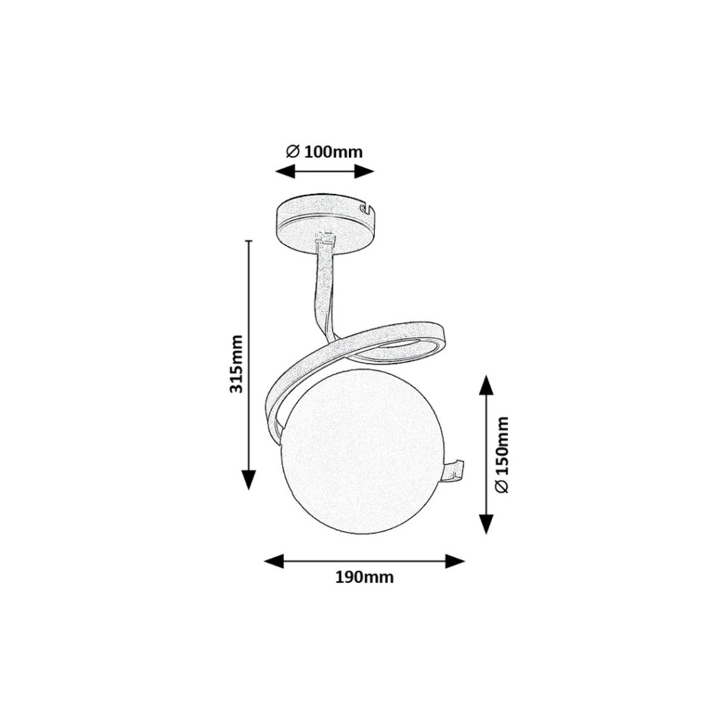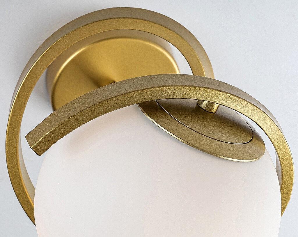 Arany színű fém vázas mennyezeti lámpa fehér színű, gömb alakú, 15cm átmérőjű üveg búrával, E27-es foglalattal.