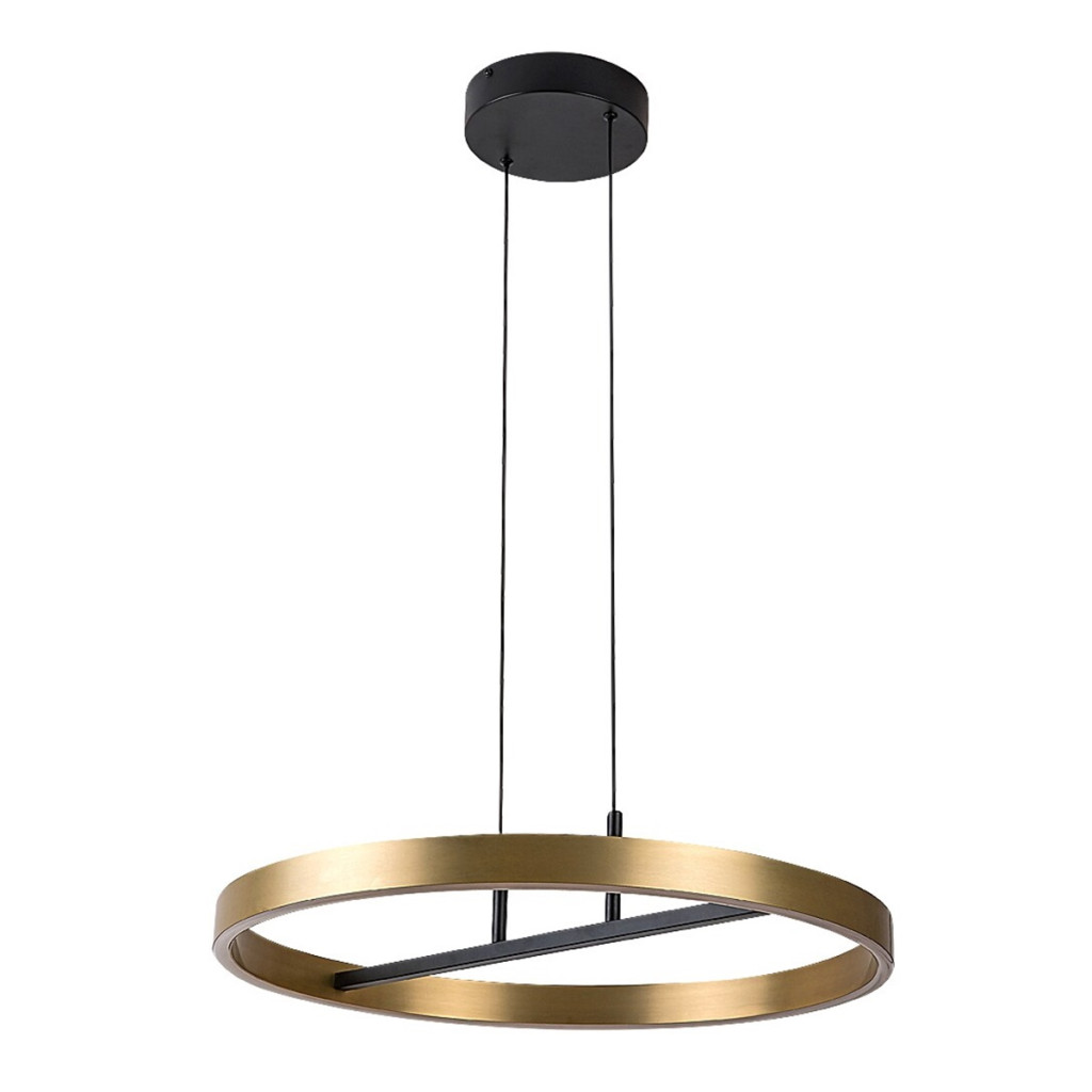 Fekete színű fém vázas függesztett lámpa arany színű fém gyűrű alakú, fehér szilikon betétes búrával, meleg fehér színhőmérsékletű beépített LED fényforrással.