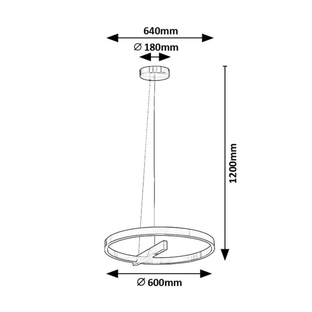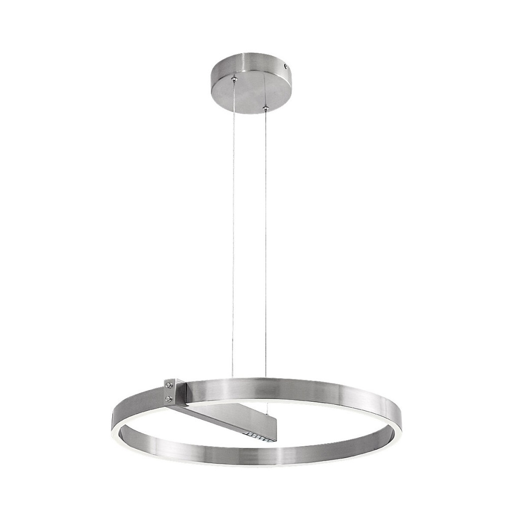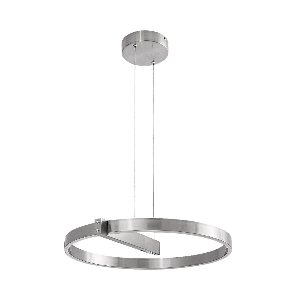 Súrolt alumínium színű fém vázas függesztett lámpa 60cm átmérőjű, gyűrű alakú, fehér szilikon betétes búrával, természetes fehér színhőmérsékletű beépített LED fényforrással. A lámpa érnitőkapcsolós, mely segítségével a gyűrűben lévő LED és a központi LED külön kapcsolható.