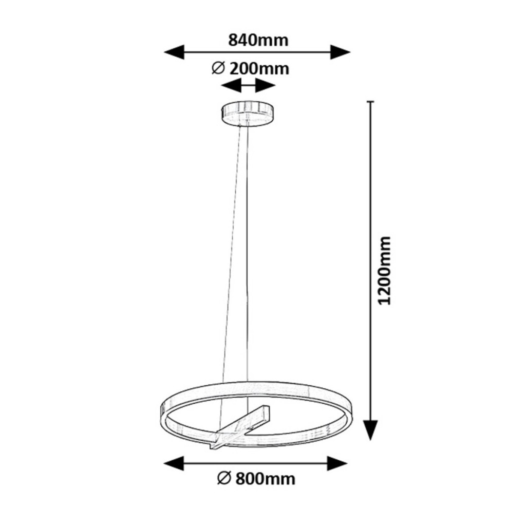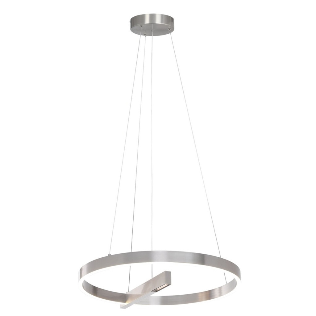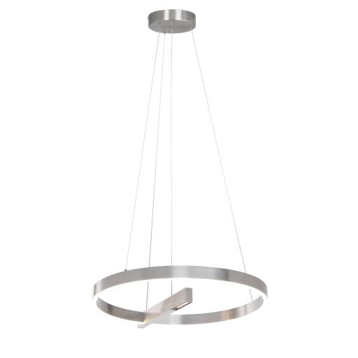 Súrolt alumínium színű fém vázas függesztett lámpa 80cm átmérőjű, gyűrű alakú, fehér szilikon betétes búrával, természetes fehér színhőmérsékletű beépített LED fényforrással. A lámpa érnitőkapcsolós, mely segítségével a gyűrűben lévő LED és a központi LED külön kapcsolható.