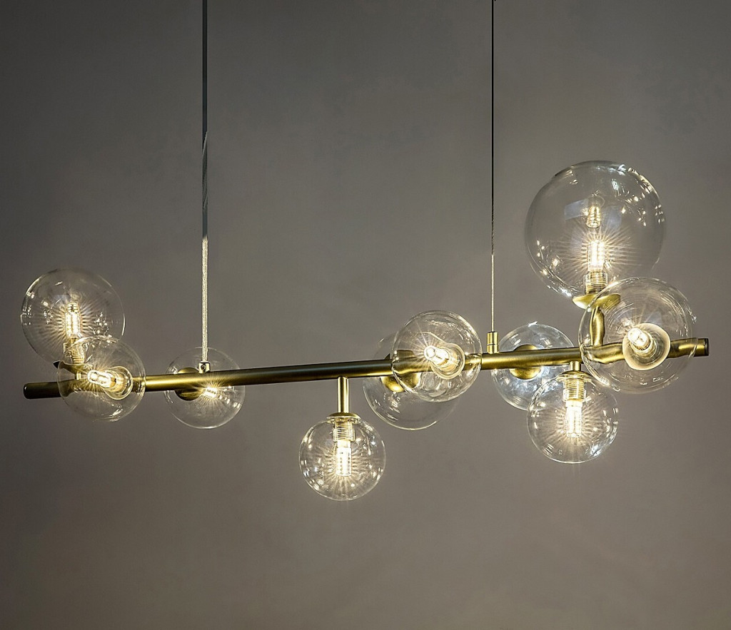 Arany színű fém vázas függesztett lámpa átlátszó, gömb alakú, 10,12 és 15cm átmérőjű üveg búrával, G9-es foglalattal.