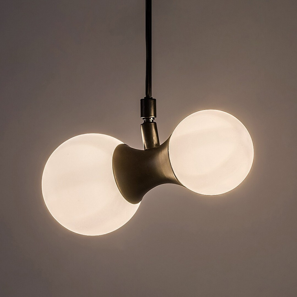 Fekete színű fém vázas függesztett lámpa fehér színű, 8 és 12cm átmérőjű, gömb alakú üveg búrával, G9-es foglalattal.