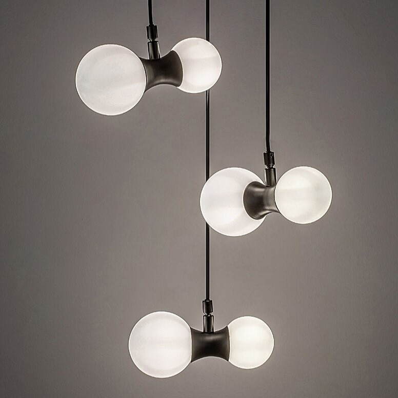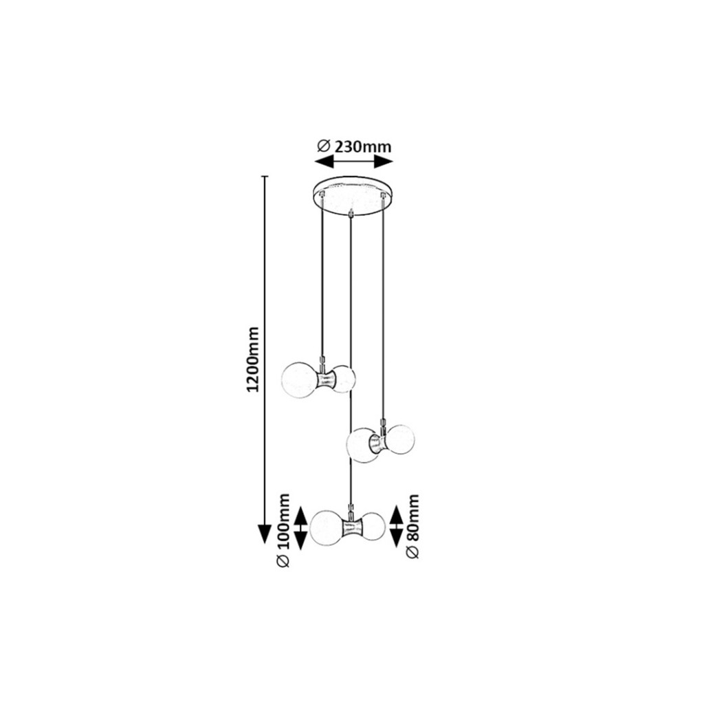 Fekete színű fém vázas függesztett lámpa fehér színű, 8 és 12cm átmérőjű, gömb alakú üveg búrával, G9-es foglalattal.