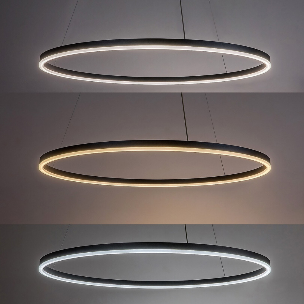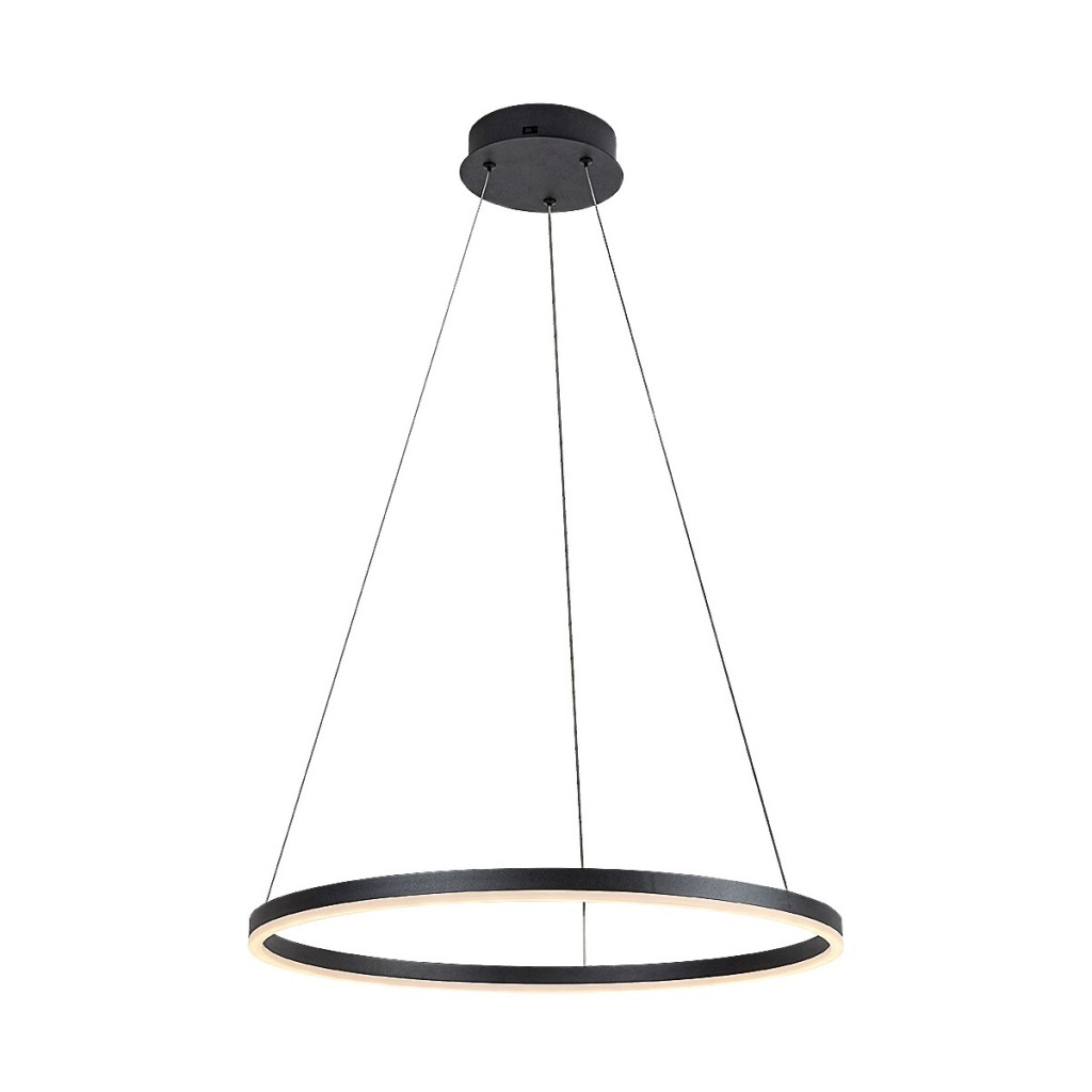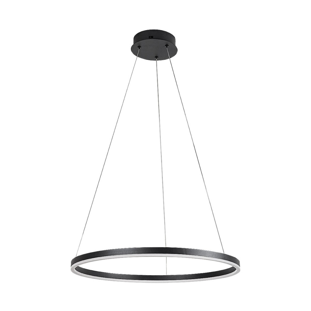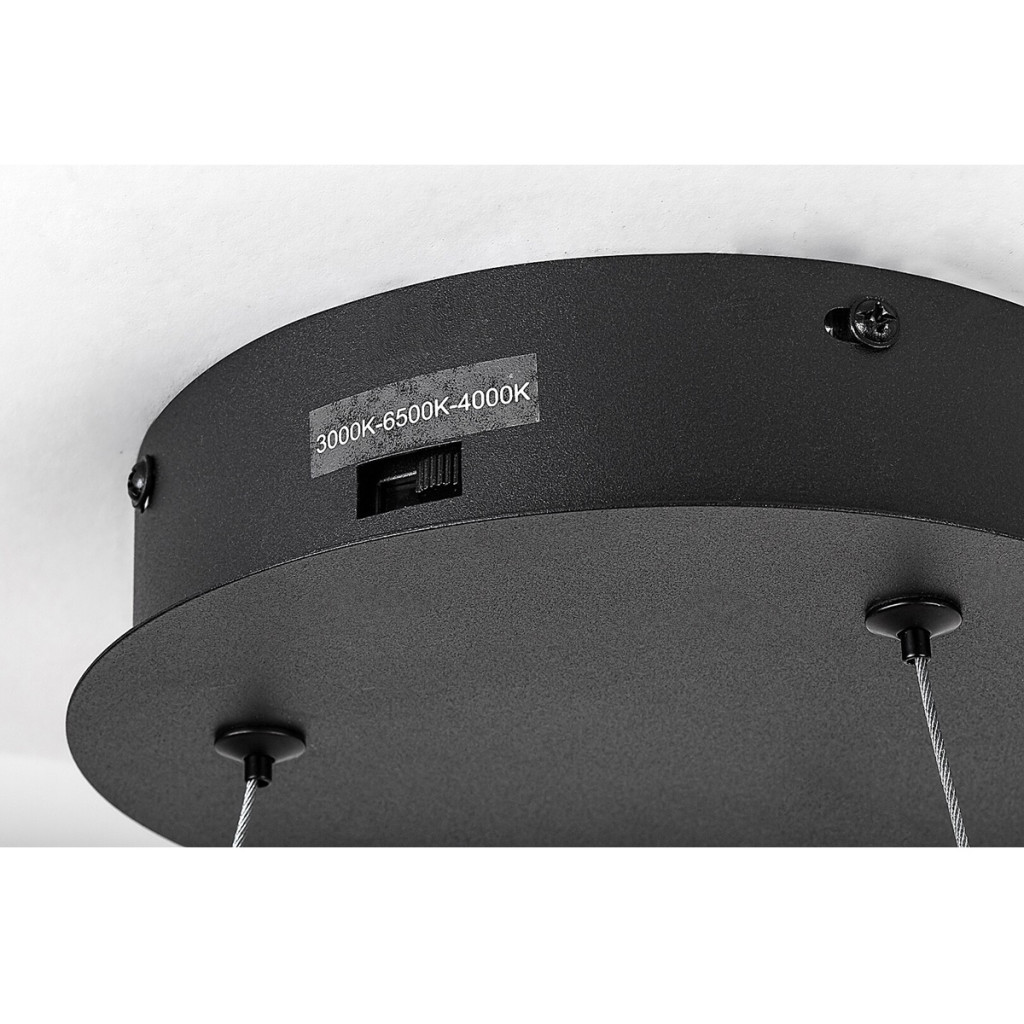 Fekete színű fém vázas függesztett lámpa 60cm átmérőjű, gyűrű alakú, fehér acryl betétes búrával, beépített LED fényforrással. A lámpa színhőmérséklete a mennyezet rózsa oldalán lévő kapcsoló segítségével állítható 3000/4000/6500K-re, azaz meleg/természetes/hideg fehér színhőmérsékletre. A lámpa belógása felszereléskor állítható 60-130cm között.