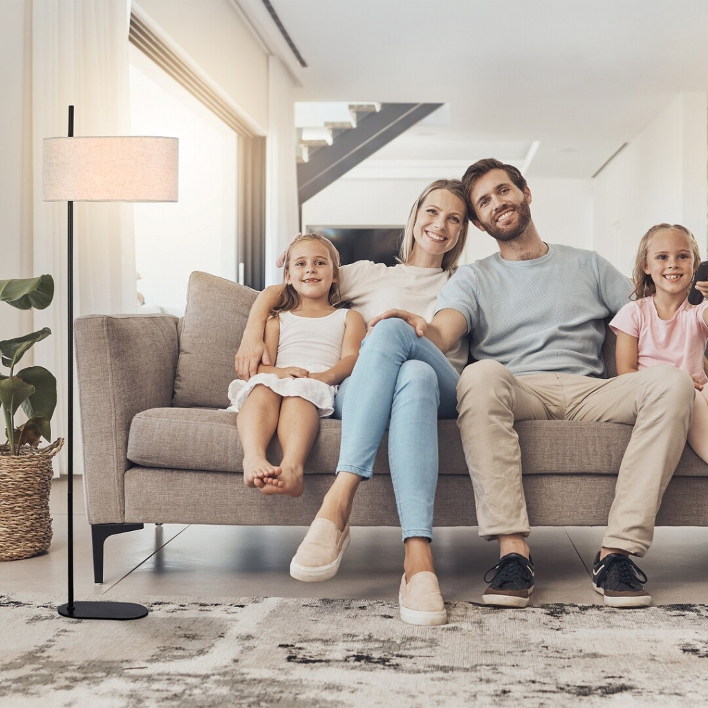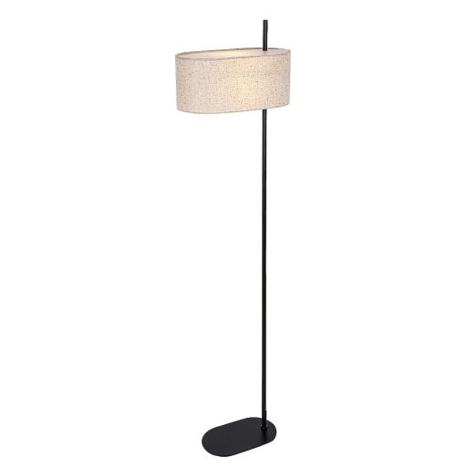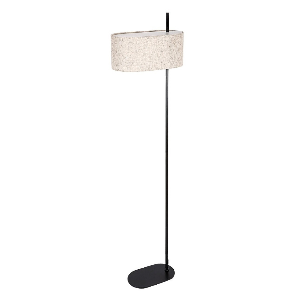 Matt fekete színű fém vázas álló lámpa bézs színű textil lámpaernyővel, 1db E27-es foglalattal, vezetékre szerelt kapcsolóval.