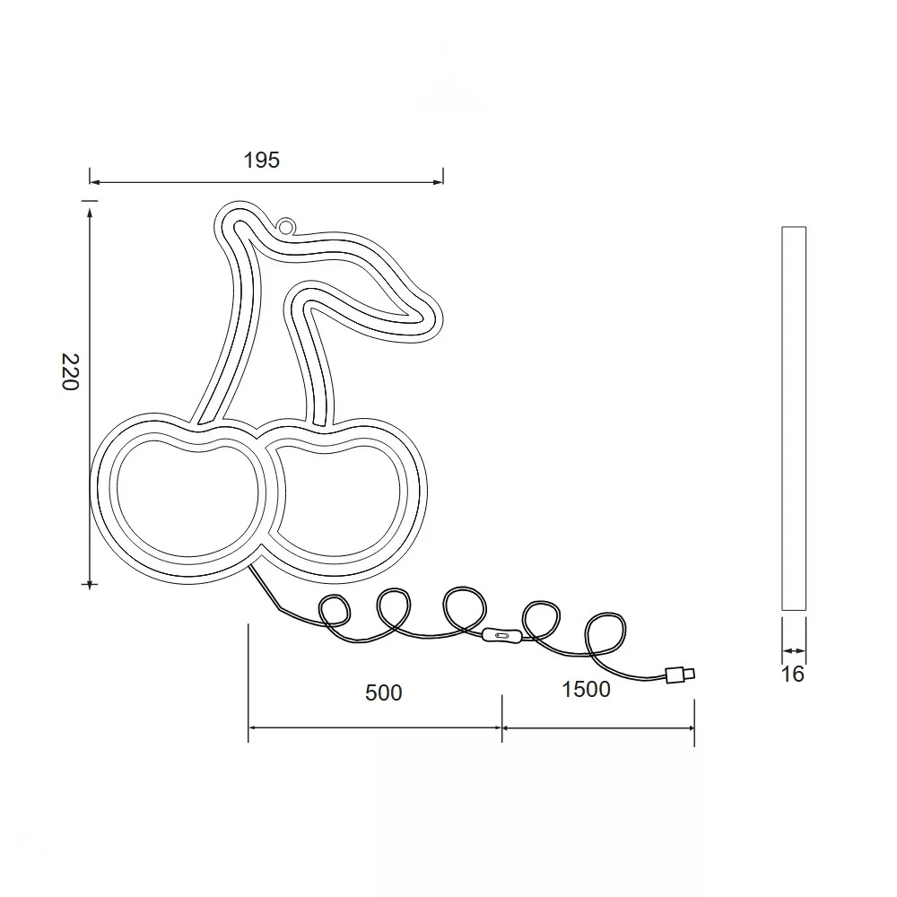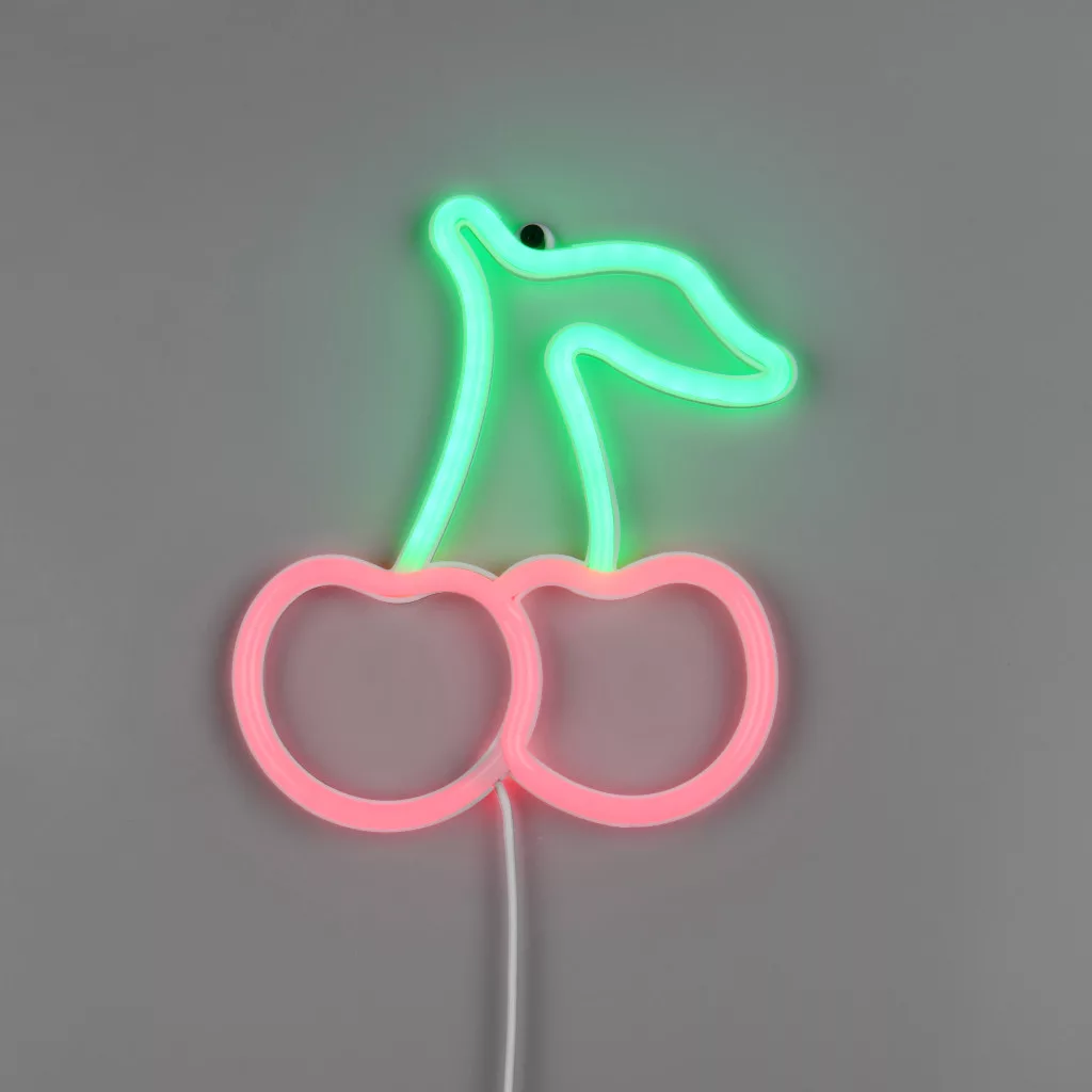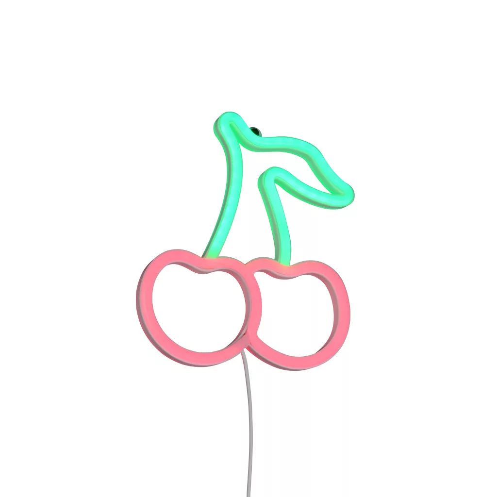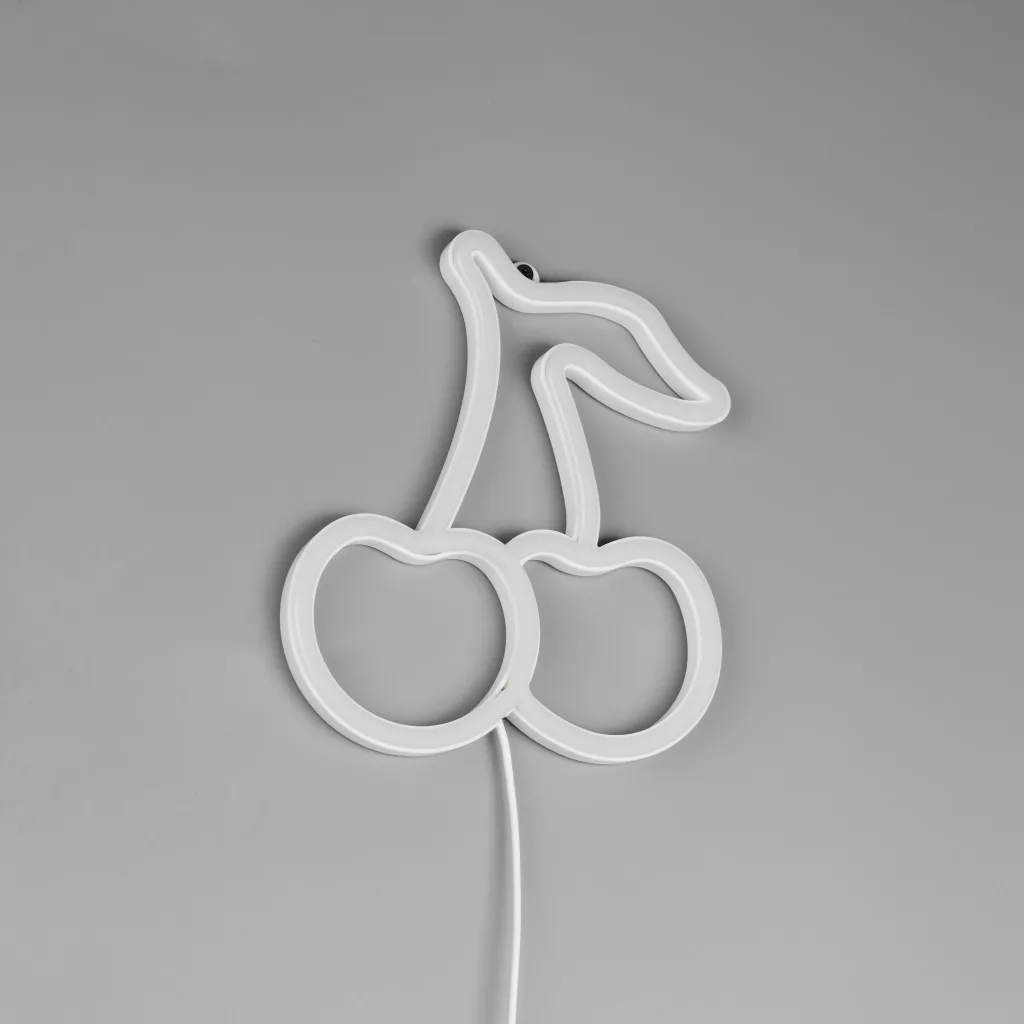Fehér színű műanyag cseresznyét formáló fali lámpa piros és zöld színű beépített LED fényforrással, vezetékre szerelt kapcsolóval. A lámpát USB-c típusú kábellel szállítjuk, adaptert nem tartalmaz.
