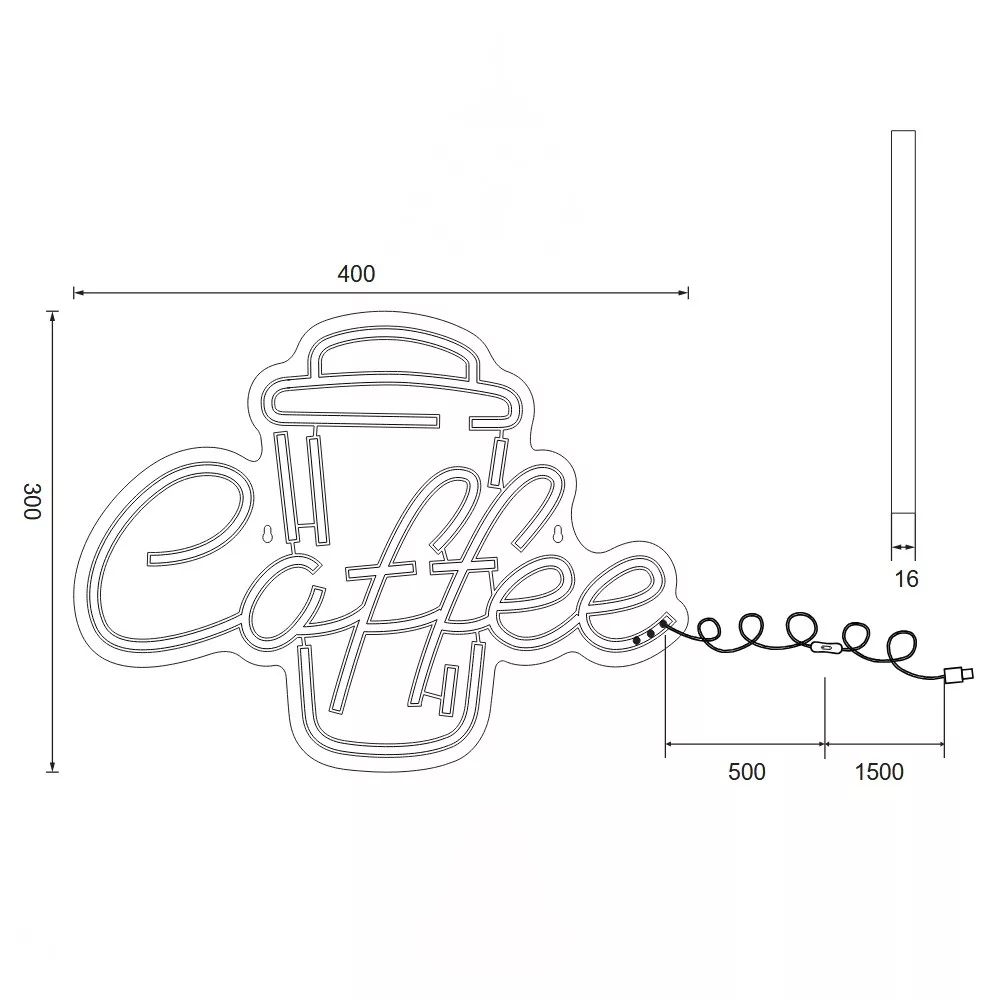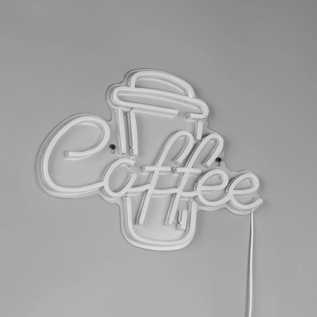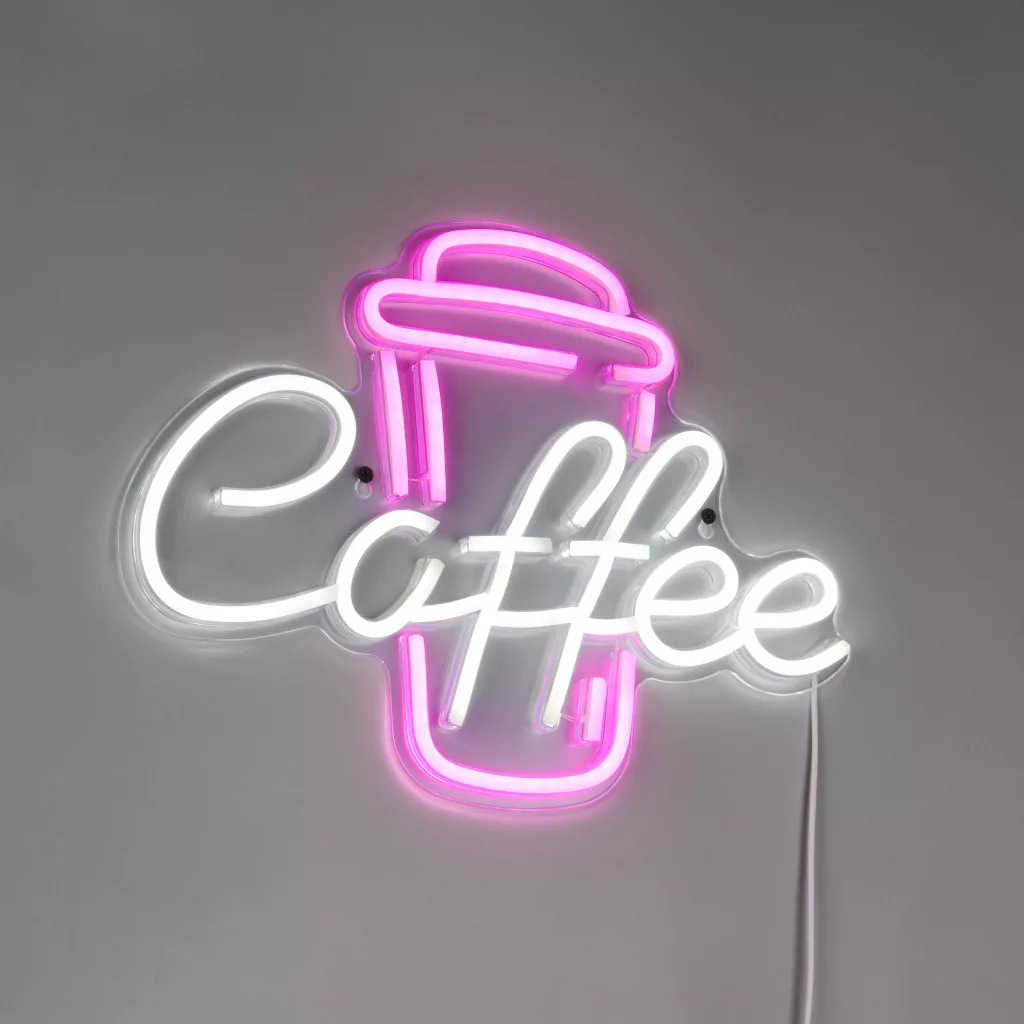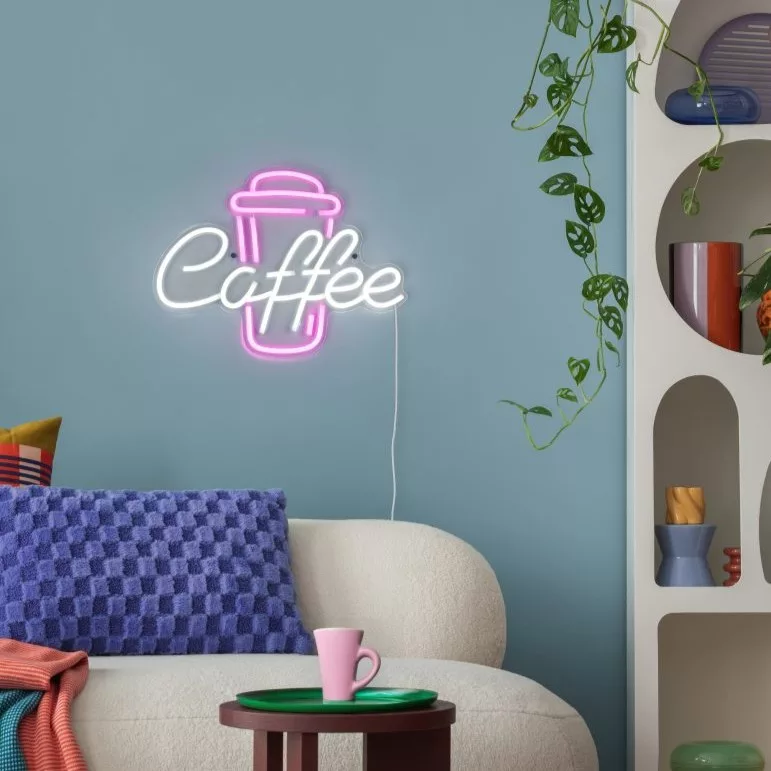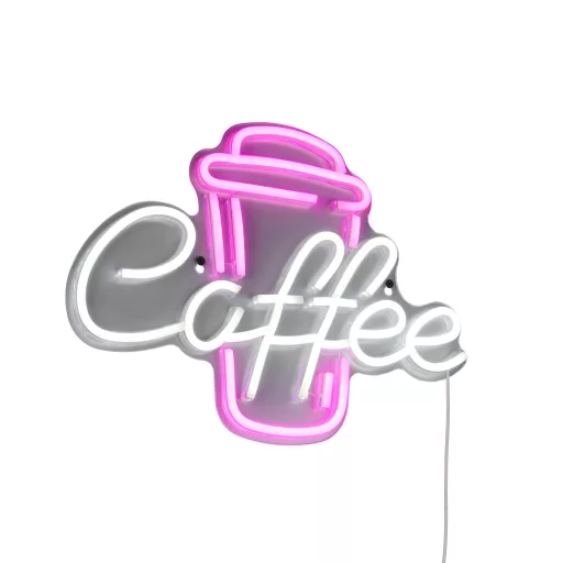 Fehér színű műanyag kávé dekoros fali lámpa fehér és rózsaszínű beépített LED fényforrással, vezetékre szerelt kapcsolóval. A lámpát USB-c típusú kábellel szállítjuk, adaptert nem tartalmaz.