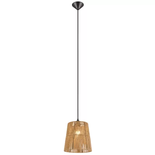 Barna színű műanyag vázas függeszték barna színű papír búrával, E27-es foglalattal.