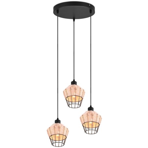 Fekete színű fém vázas függeszték fekete-natúr színű fém és rattan búrával, E27-es foglalattal.