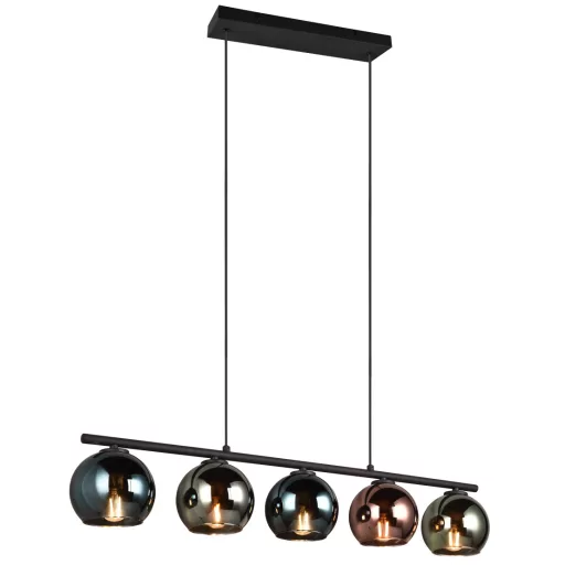 Fekete színű fém vázas függeszték színű kék-zöld-réz búrával, E14-es foglalattal.