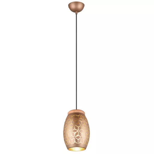 Kávé színű fém vázas függeszték kávé színű fém és fa búrával, E27-es foglalattal.