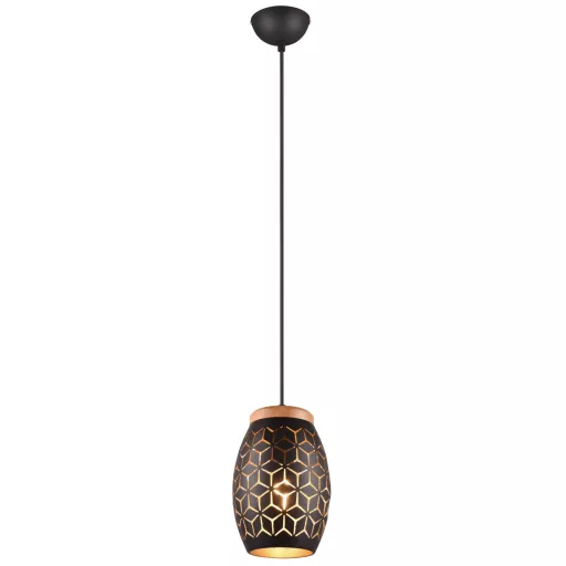 Fekete-arany színű fém vázas függeszték fekete-arany színű fém és fa búrával, E27-es foglalattal.