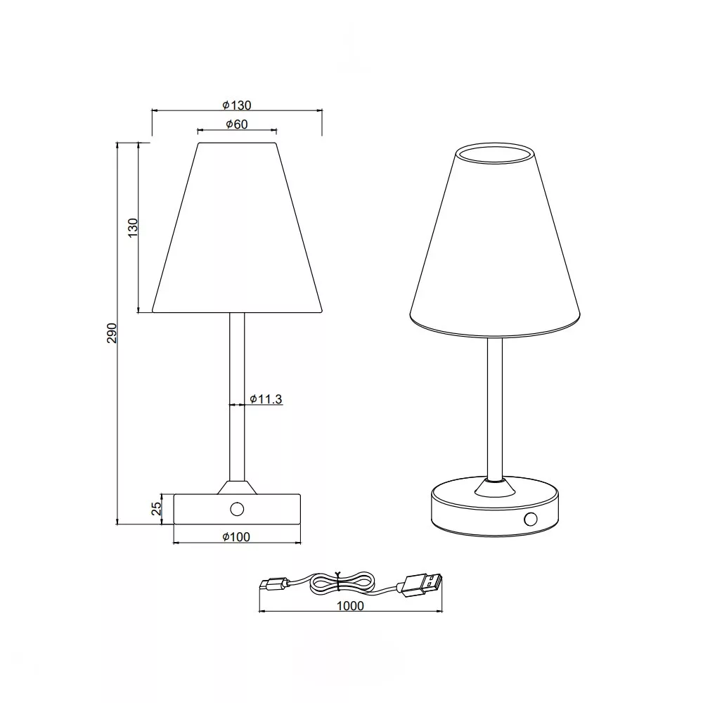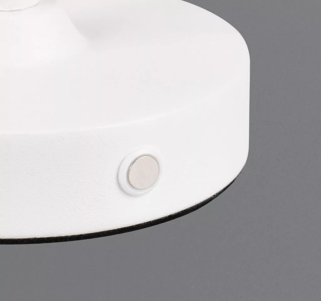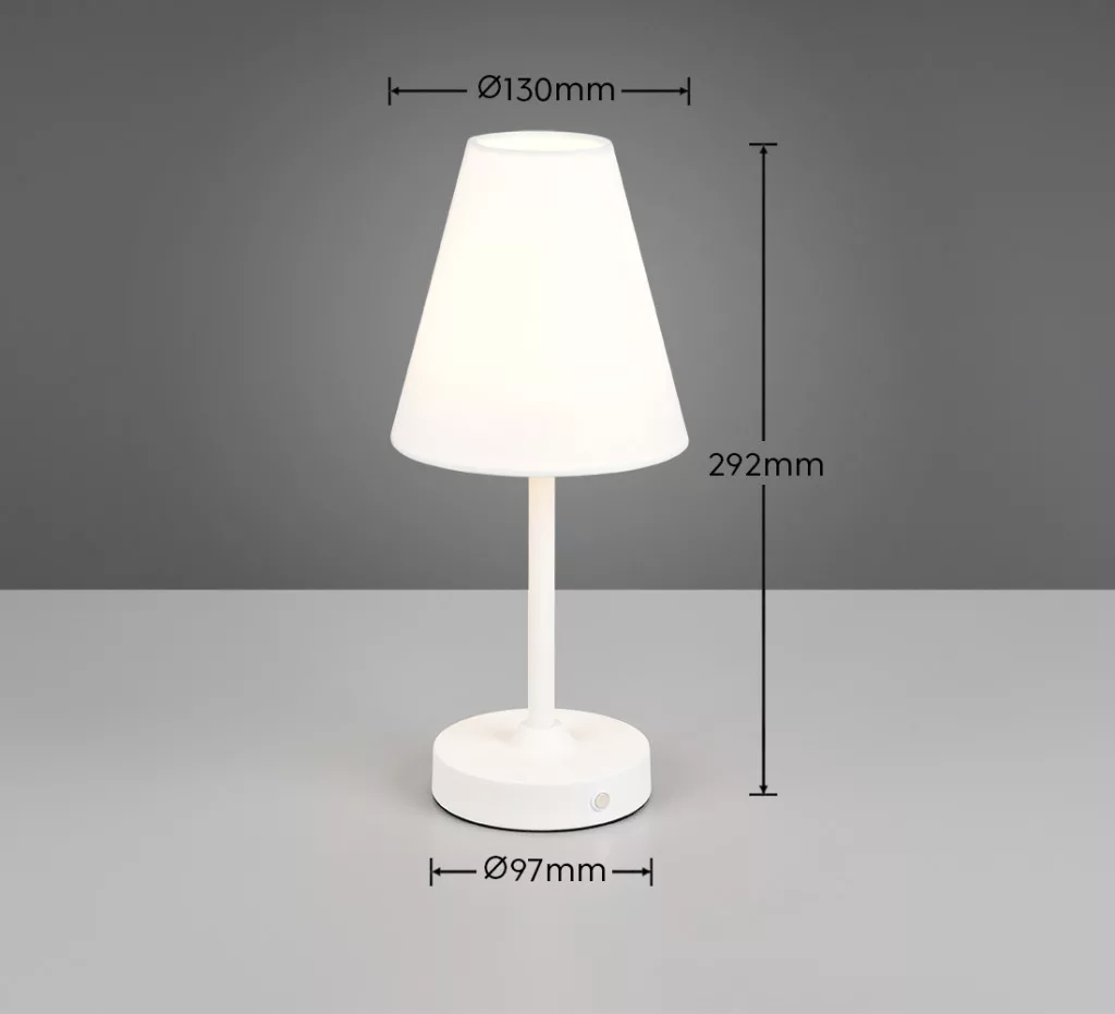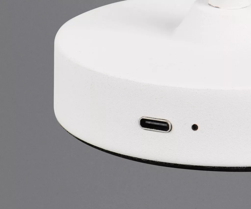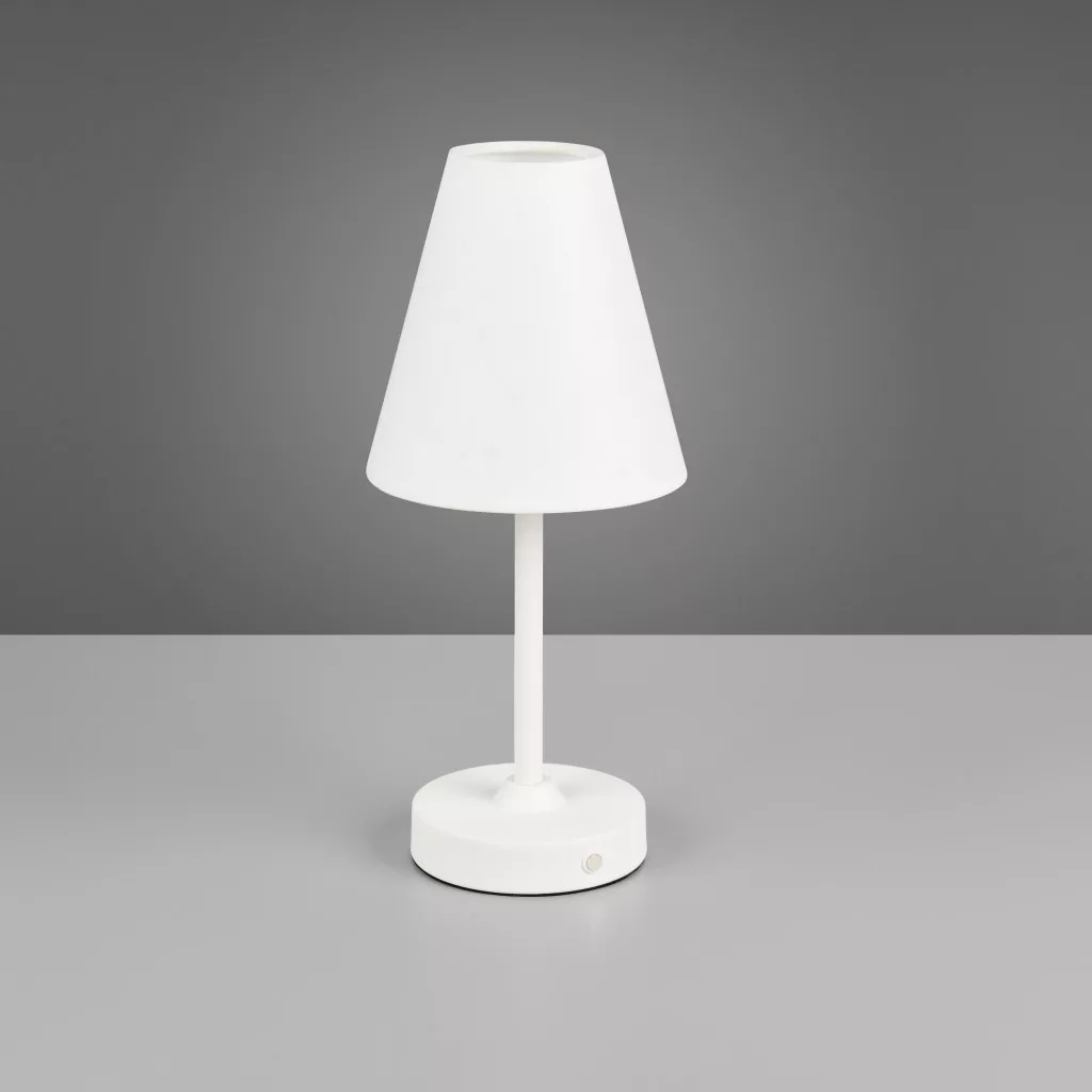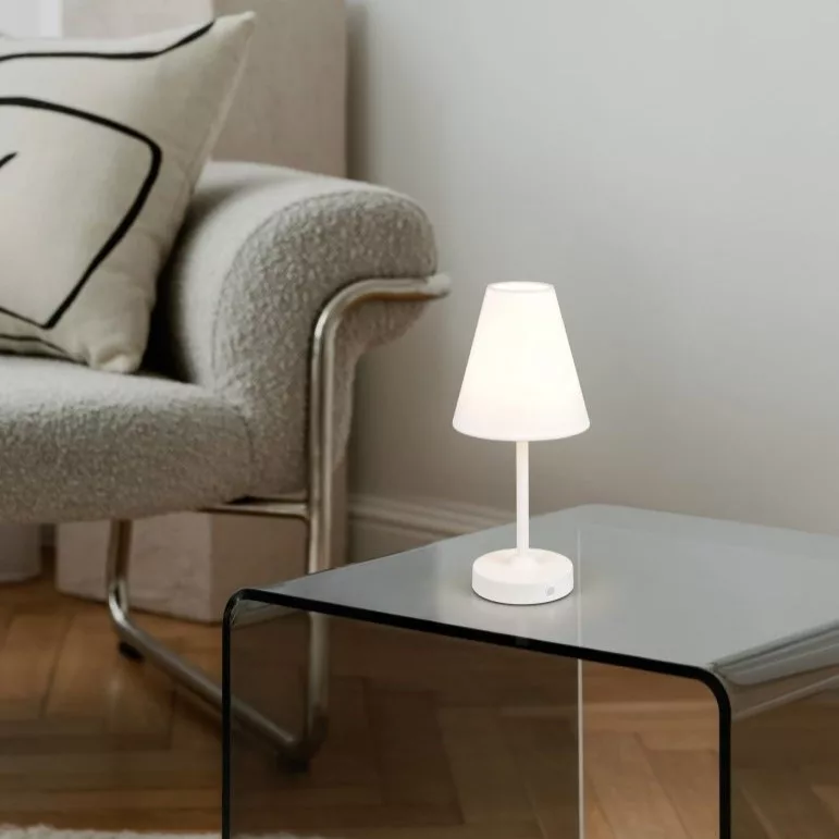 Fehér színű fém vázas akkumulátoros lámpa fehér színű textil borításos búrával, meleg fehér színhőmérsékletű beépített LED fényforrással. A lámpa fényereje érintéssel 3 lépcsőben szabályozható. A lámpa könnyedén tölthető USB kábelen keresztül. A feltöltés 4-5 órát vesz igénybe, amivel 5-6 órán át képes világítani a lámpa.