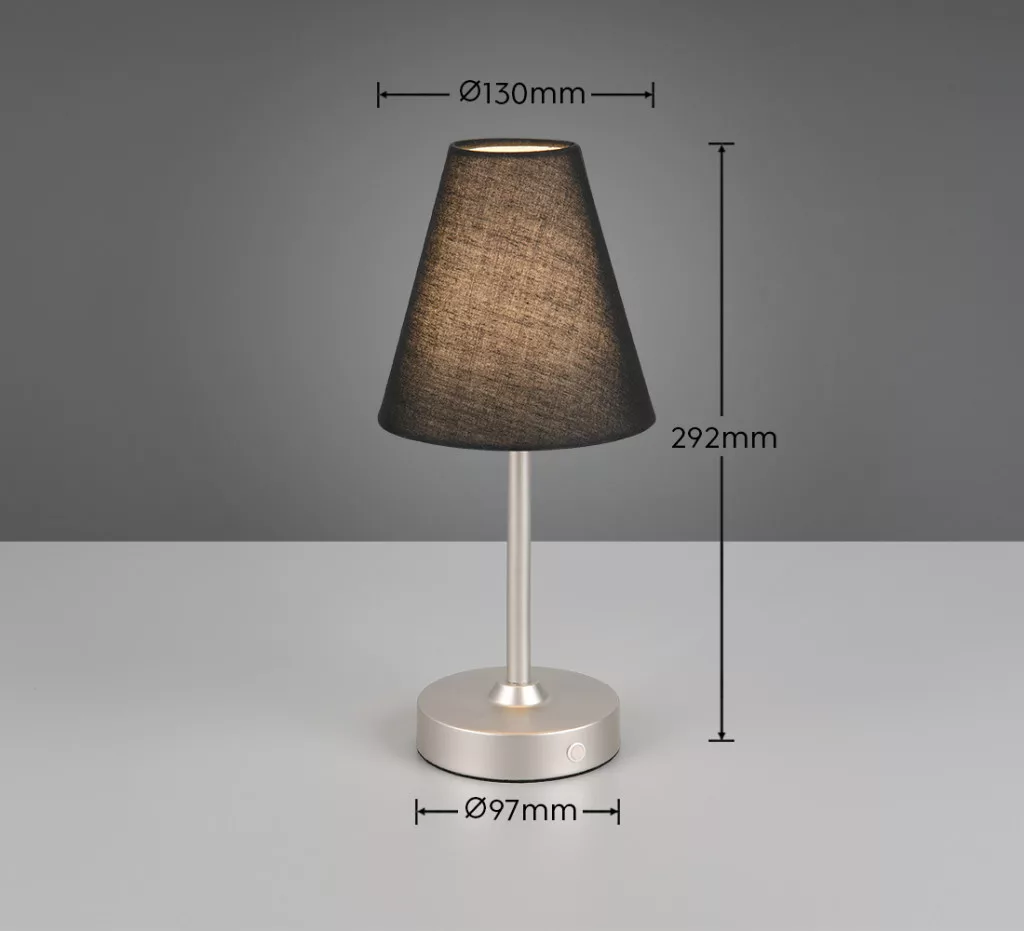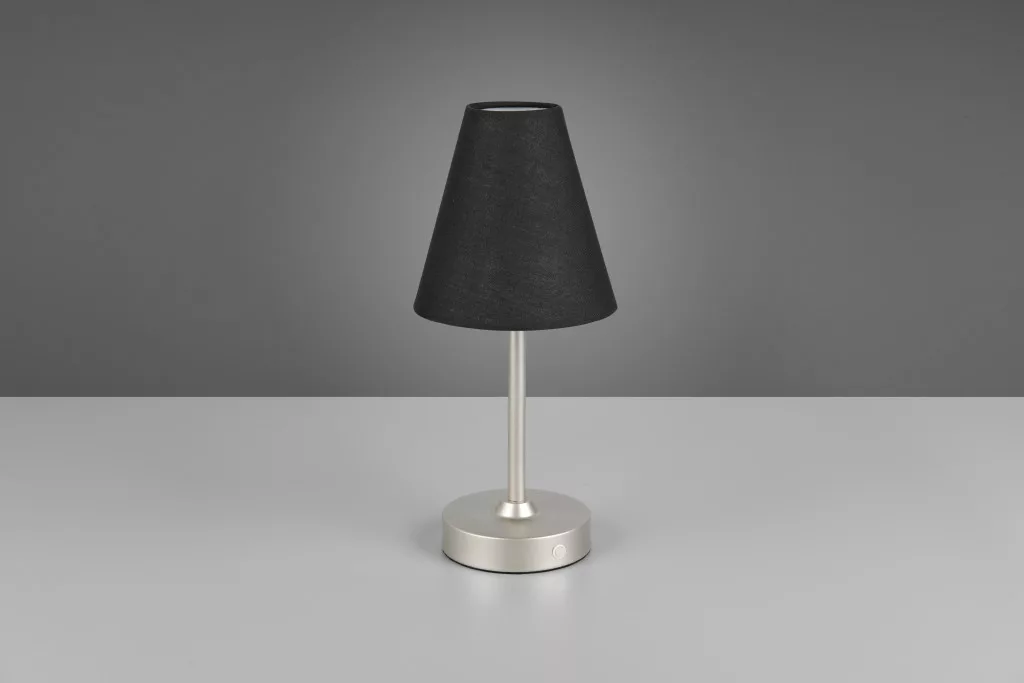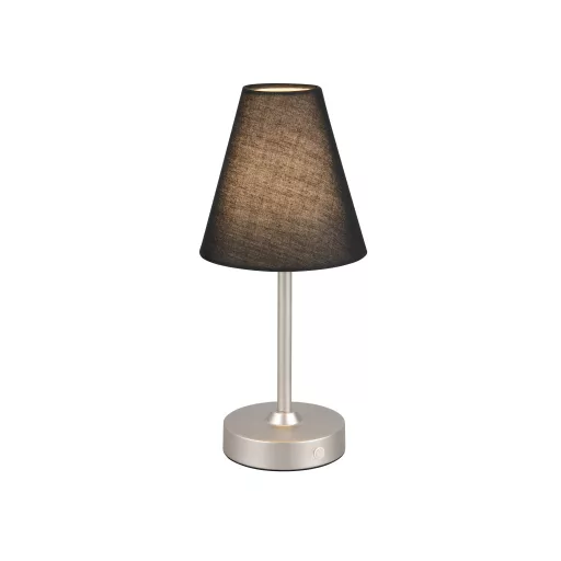 Nikkel színű fém vázas akkumulátoros lámpa fekete színű textil borításos búrával, meleg fehér színhőmérsékletű beépített LED fényforrással. A lámpa fényereje érintéssel 3 lépcsőben szabályozható. A lámpa könnyedén tölthető USB kábelen keresztül. A feltöltés 4-5 órát vesz igénybe, amivel 5-6 órán át képes világítani a lámpa.