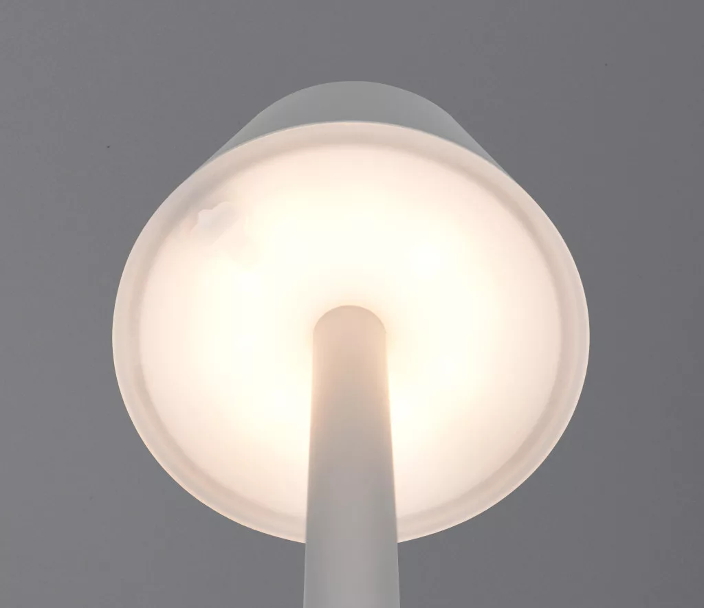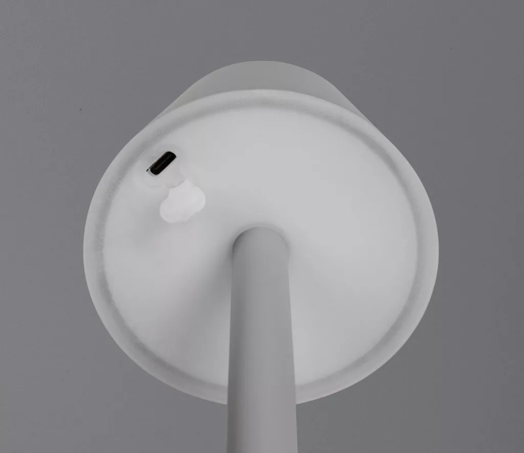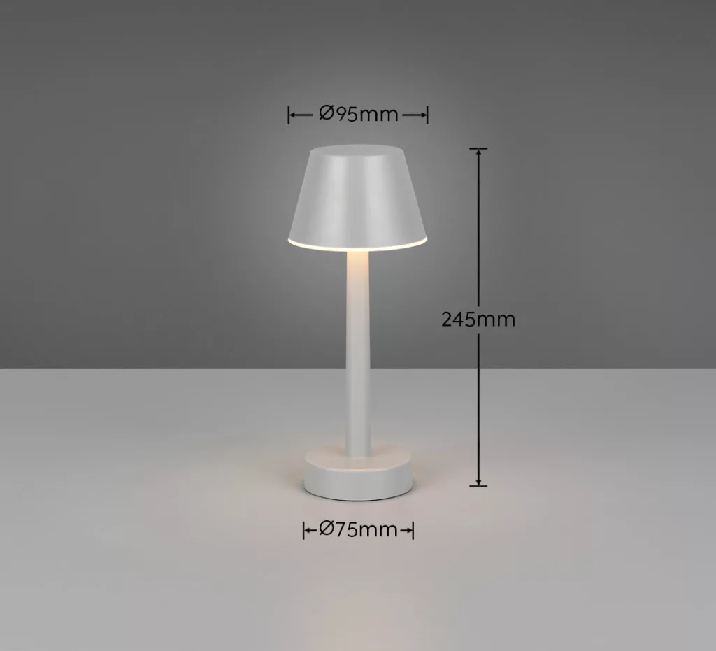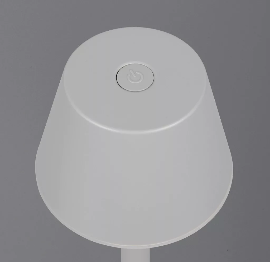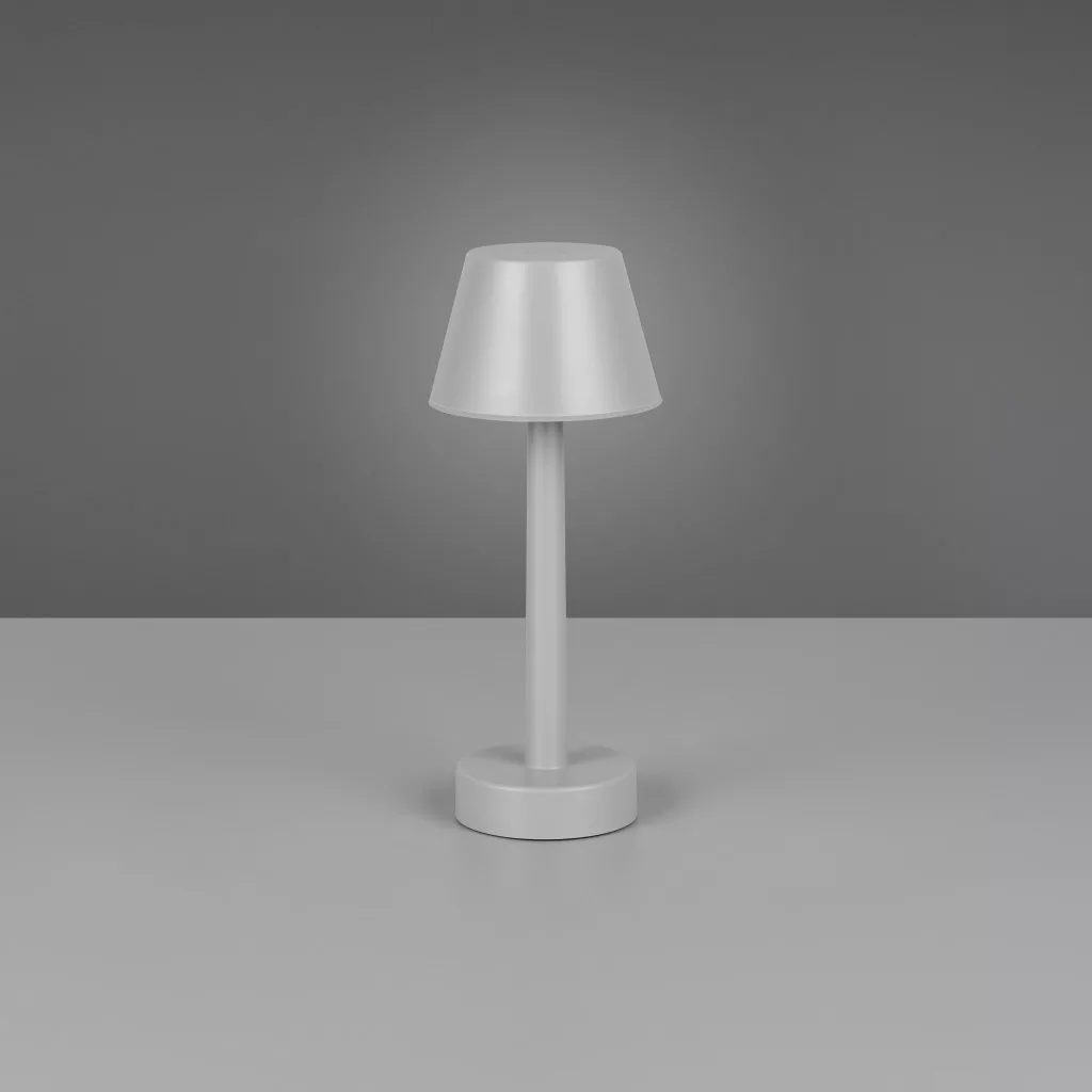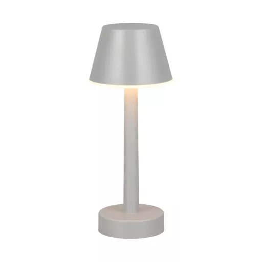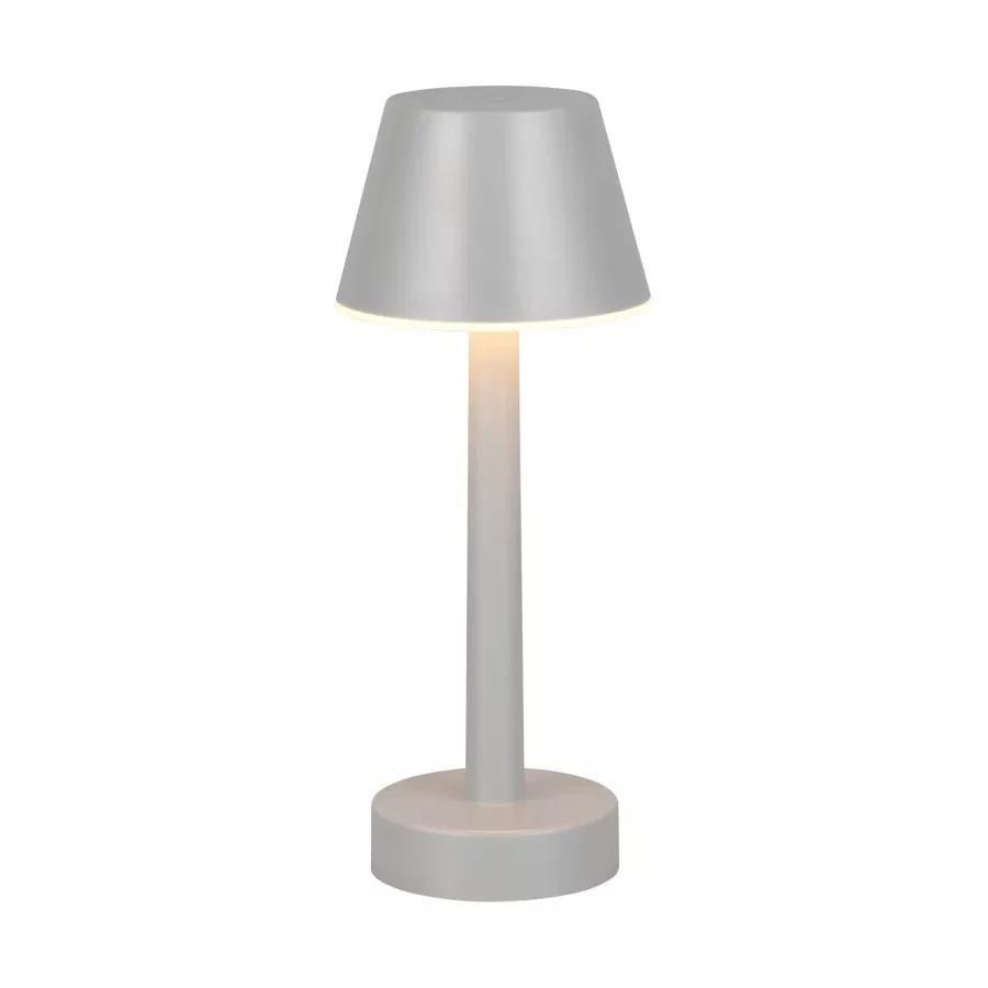 Szürke színű műanyag akkumulátoros asztali lámpa meleg fehér színhőmérsékletű beépített LED fényforrással, IP44-es védelemmel. A lámpa fényereje érintéssel 3 lépcsőben szabályozható.
