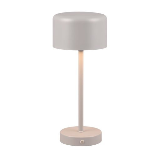 Szürke színű fém vázas dekorációs lámpa szürke színű fém és műanyag búrával, meleg fehér színhőmérsékletű beépített LED fényforrással. A lámpa egyéb jellemző(i): érintő kapcsolós, fényerőszabályzós. A lámpa fényereje érintéssel 4 lépcsőben szabályozható. A lámpa akkumulátorral működik, amit a lámpán lévő USB porton keresztül lehet tölteni.