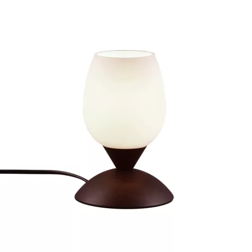 Rozsdabarna színű fém vázas éjjeli lámpa fehér színű üveg búrával, E14-es foglalattal. A lámpa egyéb jellemző(i): érintő kapcsolós.