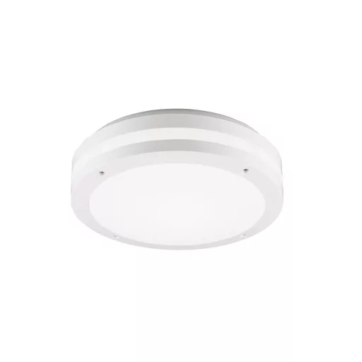 Fehér színű műanyag kültéri mennyezeti lámpa meleg fehér színhőmérsékletű beépített LED fényforrással, IP54-es védelemmel.